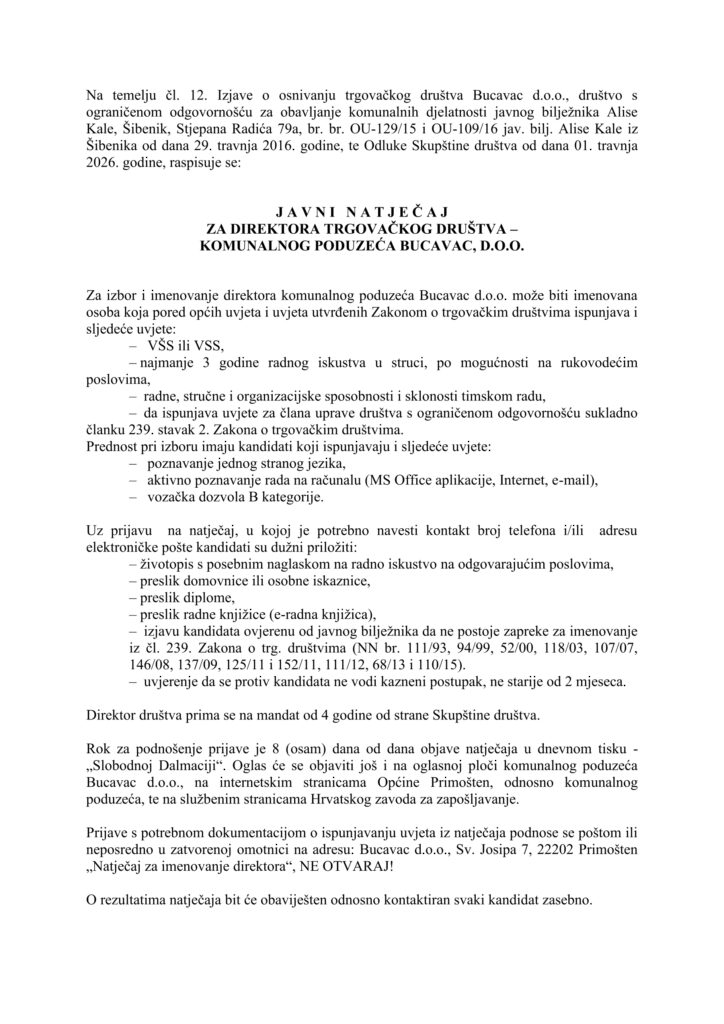 • JAVNI NATJEČAJ za direktora trgovačkog društva – komunalnog poduzeća Bucavac d.o.o.